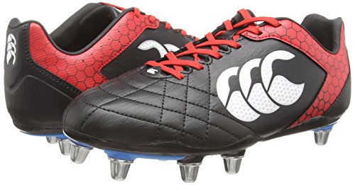 Meeting the demands of powerful forward play, Canterbury's Stampede Club 8 Stud SG Rugby Boots can even be converted to 9 studs.Designed with a durable and textured synthetic upper, the traditional central lacing system and fitted tongue further improve the overall fit to leave your feet feeling snug and well supported. Inside the boot and cushioned padding around the heel and ankle provides welcome protection and also enhances the overall comfort.With the majority of rugby matches and training taking place in demanding conditions, you need a boot which you can rely on to deliver the best performance. With the Stampede Club, a configuration of eight screw in studs means extra power, grip and stability across natural soft surfaces all year round. There is even space to add an extra stud in the centre of the forefoot should you feel the need for even more power and drive in your game.For players who are serious about their game, the Stampede Club comfortably delivers performance in a pair of affordable rugby boots.This rugby boot weighs 351g (UK size 7).Make sure you kit yourself out with a spare set of rugby studs.