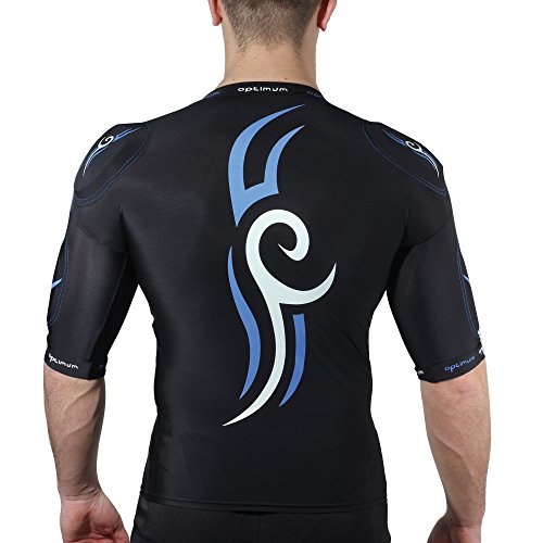 Body Protection Made by Optimum. This top is made from lightweight lycra and it has an extra long length body for comfort as it doesn't ride up as much. Perfect for all rugby players as All the padding in these shoulder pads can be removed so that you can wash the top. The pads are 10mm thick on the shoulders and 5mm thick on the biceps and the sternum. Colour Black/Blue For added confidence going into every tackle, this body armour has been approved by the IRB. Size Small, Medium, Large, XL, XXL